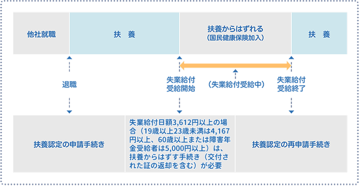 なお、退職翌日から扶養認定された場合でも、失業保険(失業給付)を受給される際の基本手当日額が、3,612円以上の場合(19歳以上23歳未満は4,167円以上、60歳以上または障害年金受給者は5,000円以上)は、その受給期間は扶養からはずれることとなります。その間は、国民健康保険に加入いただき、受給終了後、再度健保組合へ扶養認定申請をしてください。解雇や倒産、配偶者転勤によるやむを得ずの退職は失業給付受給が早期になる場合がありますので、ハローワークにお問い合わせください。