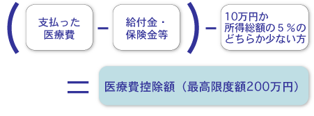 前年1月から12月までに支払った医療費が10万円(または年間所得の5%の少ないほう)を超えるとき、上限200万円までがあなたの課税所得額から控除され、税金が確定精算されます。